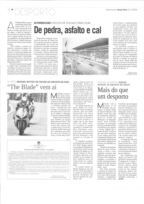 | 4-21-2015 - "Mais do que um desporto" Article in Hoje Macau Newspaper |