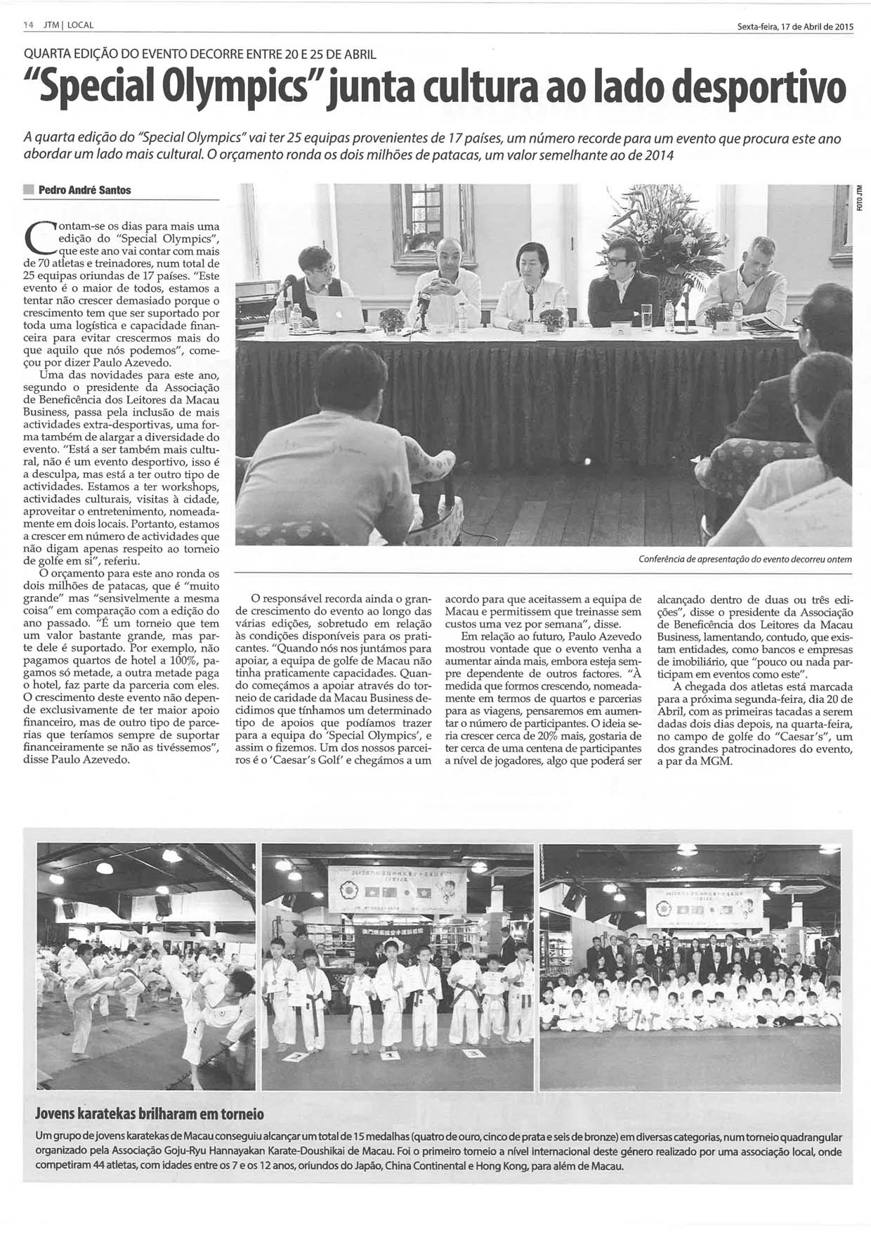 | 4-17-2015 - "Special Olympics junta cultura ao lado desportivo" published in Jornal Tribuna de Macau |