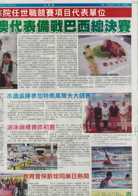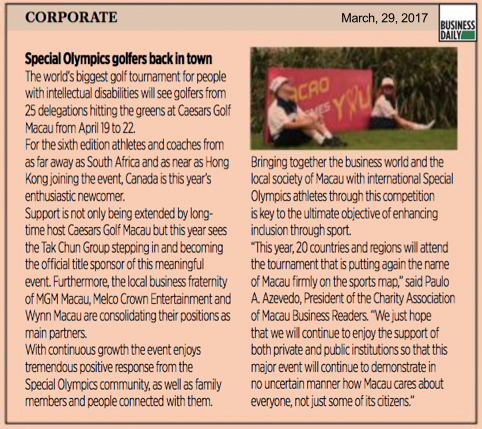 | 05-26-2014 - "Biggest Special Olympics golf tournament tees off today at Caesars Golf Macau", news article in Business Daily |