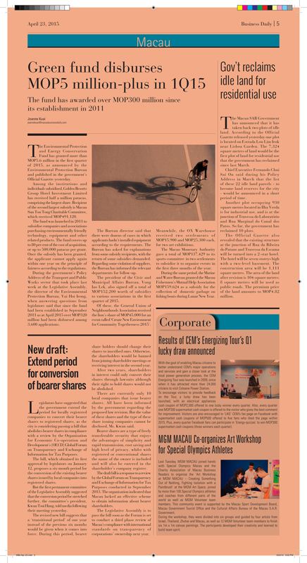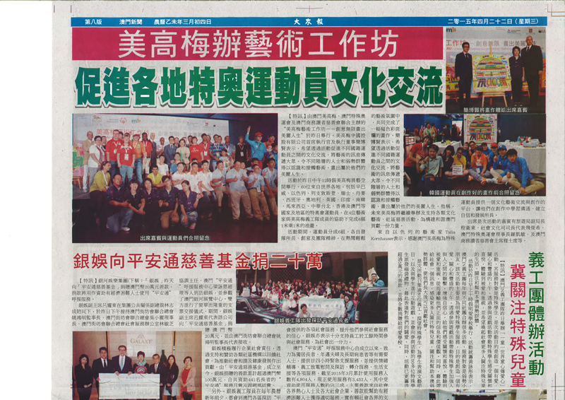 | 4-23-2015 - "MGM Macau Co-organizes Art Workshop for Special Olympics Athletes" published in Macau Business Daily |