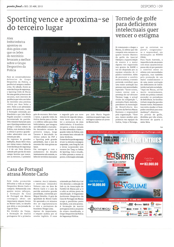 | 4-20-2015 - "Torneio de golfe para deficientes intelectuais quer vencer o estigma" Article published in Ponto Final |
