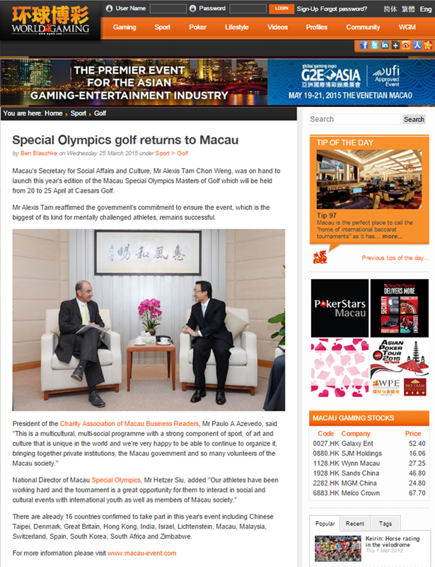 | 03-25-2015 - "Macau Special Olympics Golf Masters returns to Macau" - published in the World Gaming Magazine (online edition) |