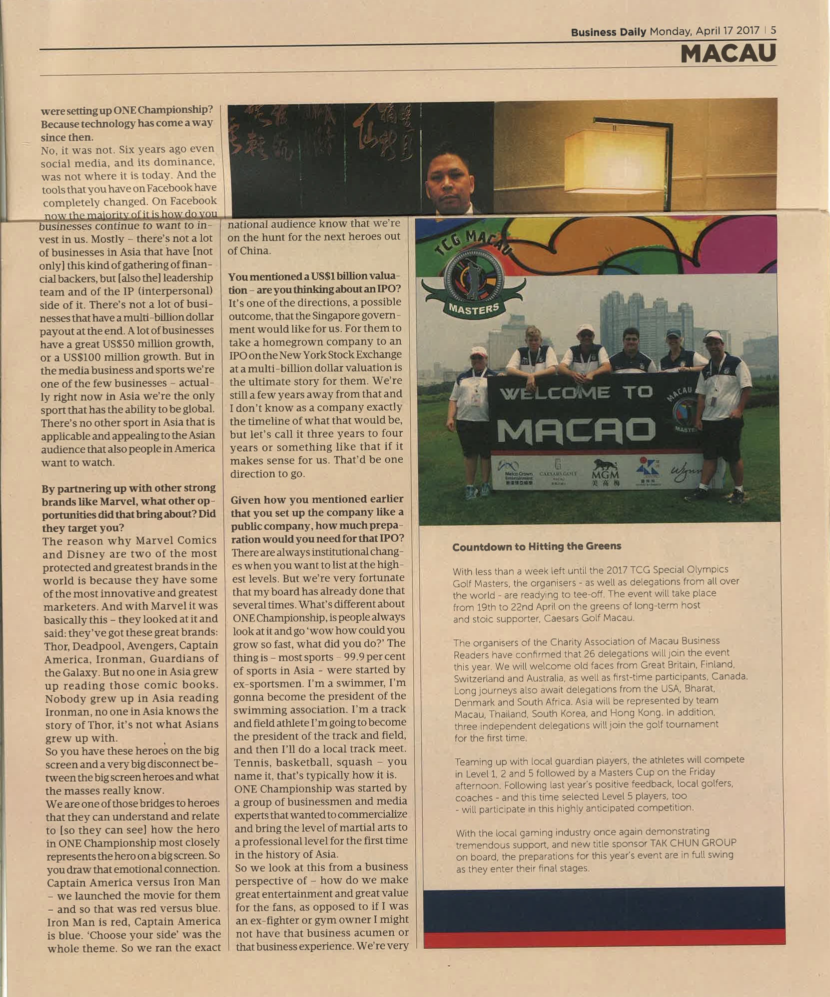 | 02-25-2016 - Press Release about the 2016 Macau Special Olmpics Golf Masters in Business Daily |