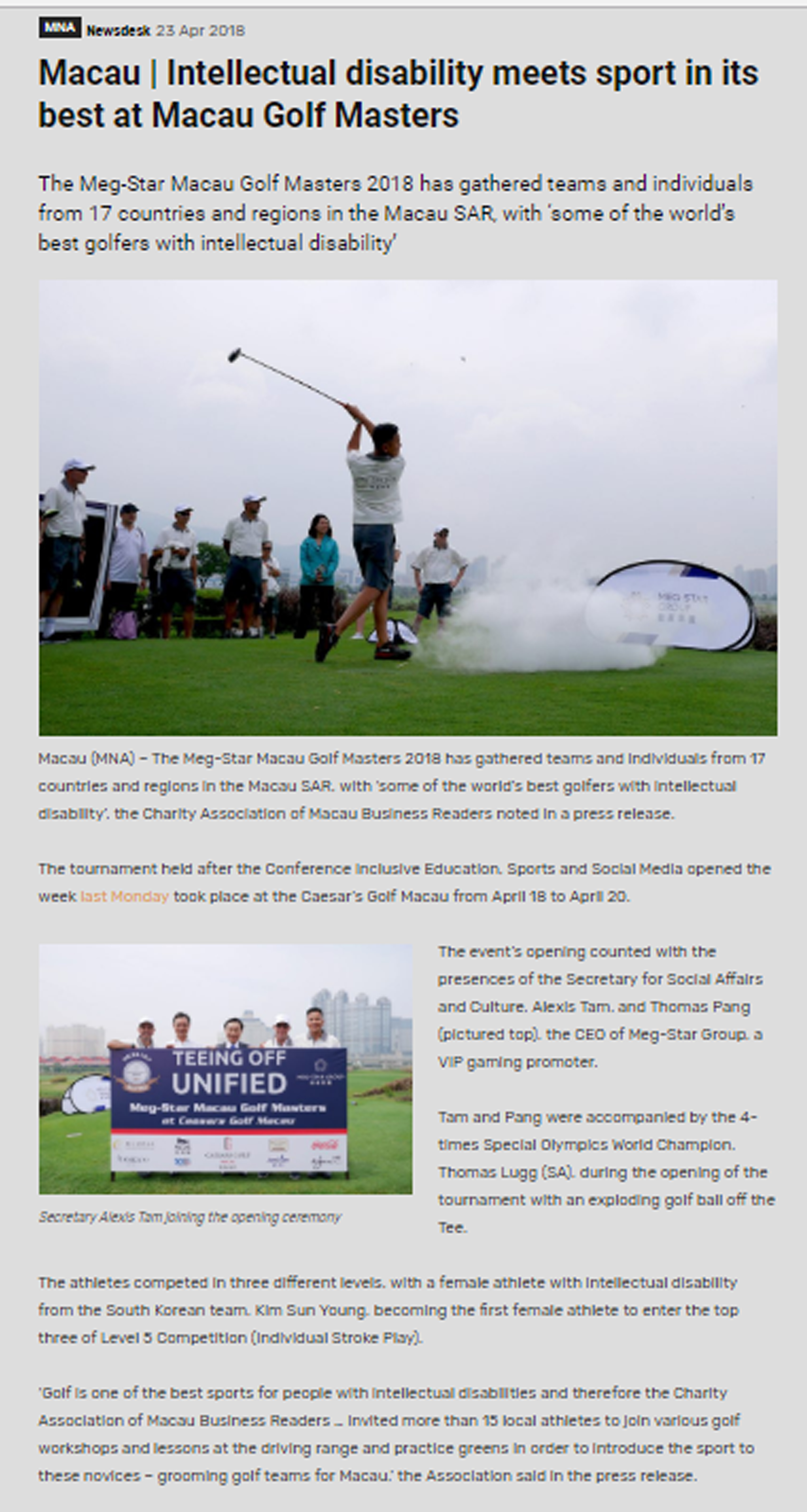| 04-2014 - "Get in the Swing - The Macau Special Olympics Golf Masters 2014 welcomes a record number of teams", news article in Macau Business |